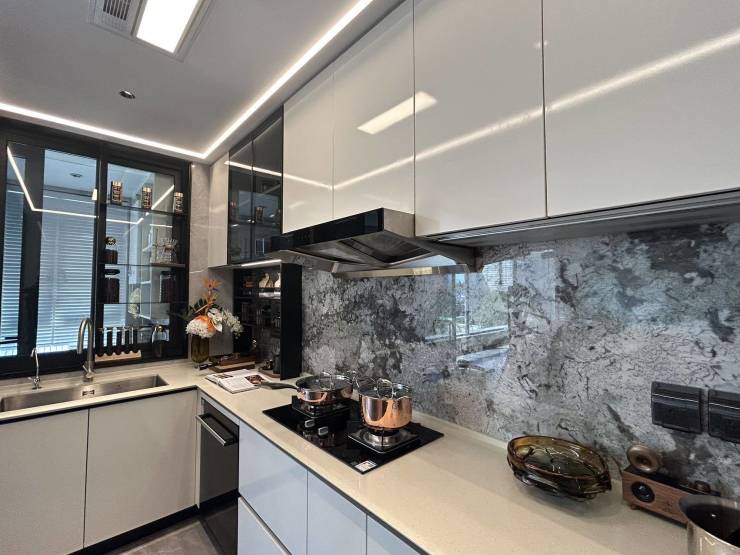 126㎡的户型为2梯2户,独立入户,拥有双面采光的电梯前厅;15米面宽+4.5开间朝南,拥有极好的日照、采光和观景效果;得房率约92%。