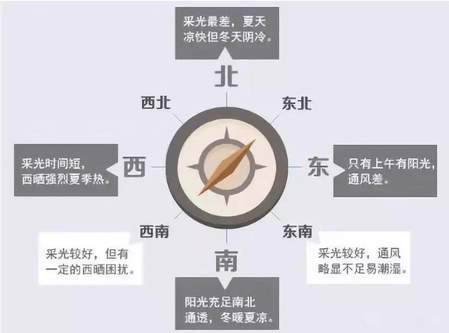 当然了,一个房子不可能只有一个朝向,毕竟功能分区就有客厅、厨房、卫生间、卧室等。在关注房屋朝向时,最主要的还是看客厅和卧室这两个功能区。