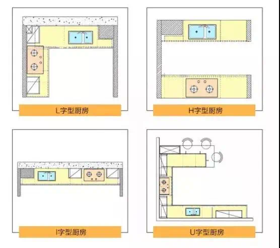 目前,市面上常见的厨房通常有I型、L型、U型三种,H型比较少见。