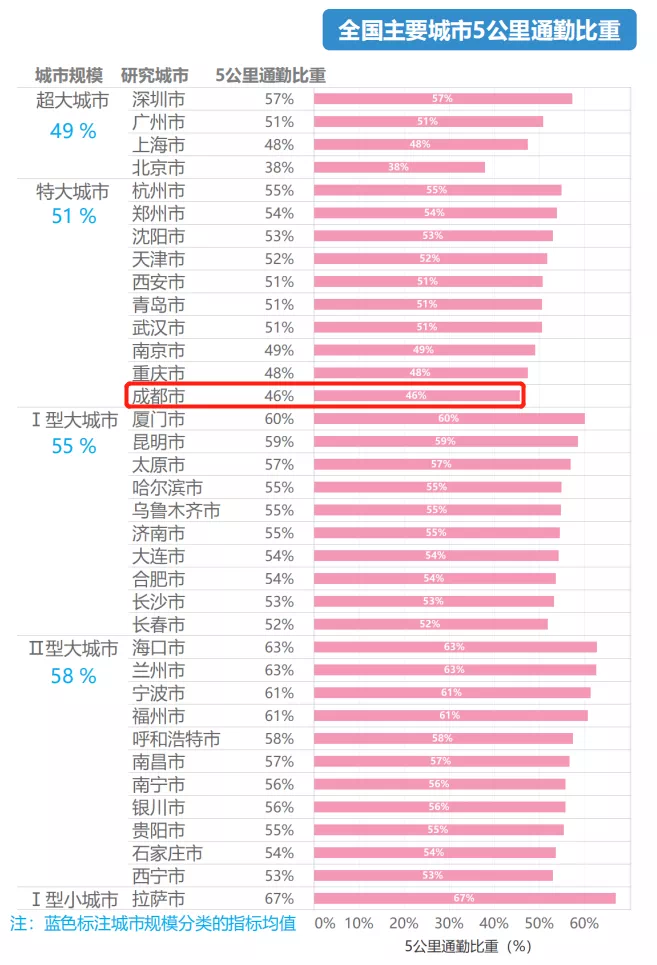 不过,值得注意的是,北上广深虽同为超大城市,但幸福通勤比重差距较大,在深圳有高达57%的上班族通勤距离在5公里以内,北京这一数据仅为38%,而成都仅有46%的上班族通勤距离在5公里以内,在特大城市中垫底,全国范围内也仅次于北京。再次心疼成都上班族。