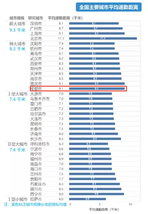 据《报告》显示,36个城市的平均通勤距离均超过6公里,且城市规模越大,平均通勤距离越长。北京再度以11.1公里的平均通勤距离位居榜首,成渝两兄弟难得一致,与上海一起并列全国第二,平均通勤距离9.1公里。