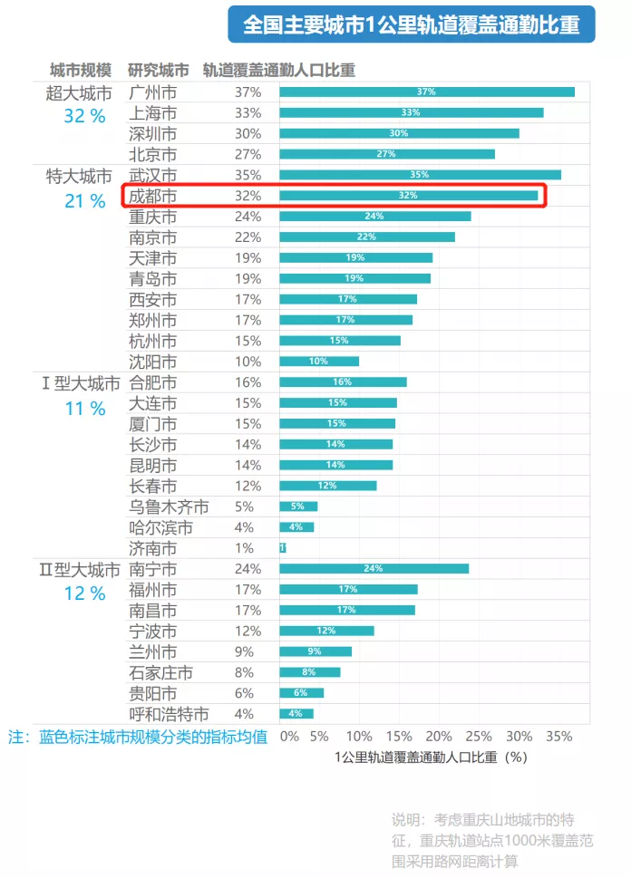 这一轮,成都终于扳回一局,在特大城市中,32%的轨道覆盖通勤人口比重,仅次于武汉的35%;放在全国,在排名前列的广州(37%)、第三的上海(33%)之后,排在全国第四,说明成都的轨道布局在满足通勤需求方面表现还是不错的。上周我们提到的5号线应该很快就会被装满,我亲爱的地铁5号线,你也太不会 “ 装 ” 了嘛!。