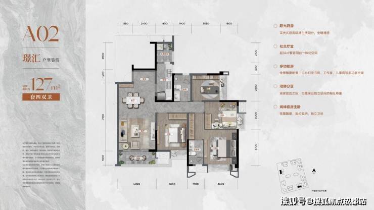 127㎡四房两卫:创新"3+1"可变空间设计,预留多功能房改造可能。双明卫设计搭配全屋飘窗,提升空间实用率约15%。