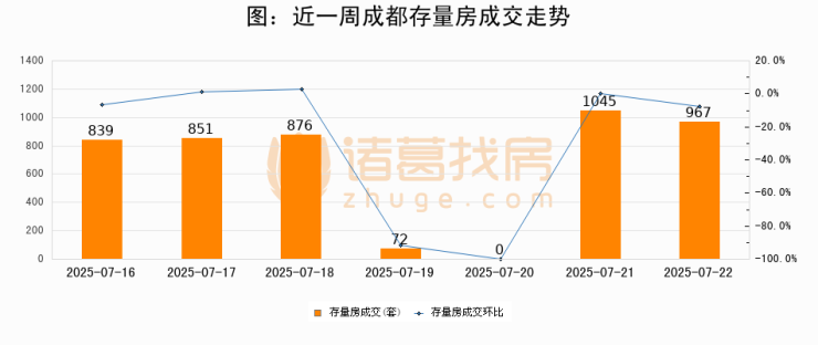 从存量房来看,2025年07月22日成都存量房单日成交967套,比昨日减少78套,环比下降7.5%。从近一周存量房成交来看,成都存量房日均成交套数为664套,07月22日单日成交967套,高于近一周平均水平45.6%。