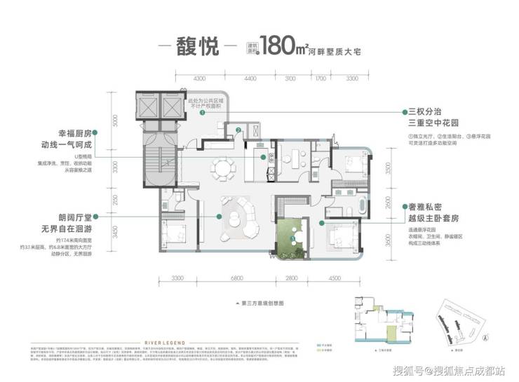 该户型以约17.4米超宽视野面打破空间界限,实现室内外景致交融。创新设计的超级大方厅配合270度采光主卧套房,重塑高端居住体验。特别值得关注的是7层纯洋房产品,独享一线清水河岸线资源。6.8米河景客厅、4.5米主卧套房、3.3米次卧套房及近10平方米空中院馆均面向清水河布局,让日常起居与自然景致相得益彰。