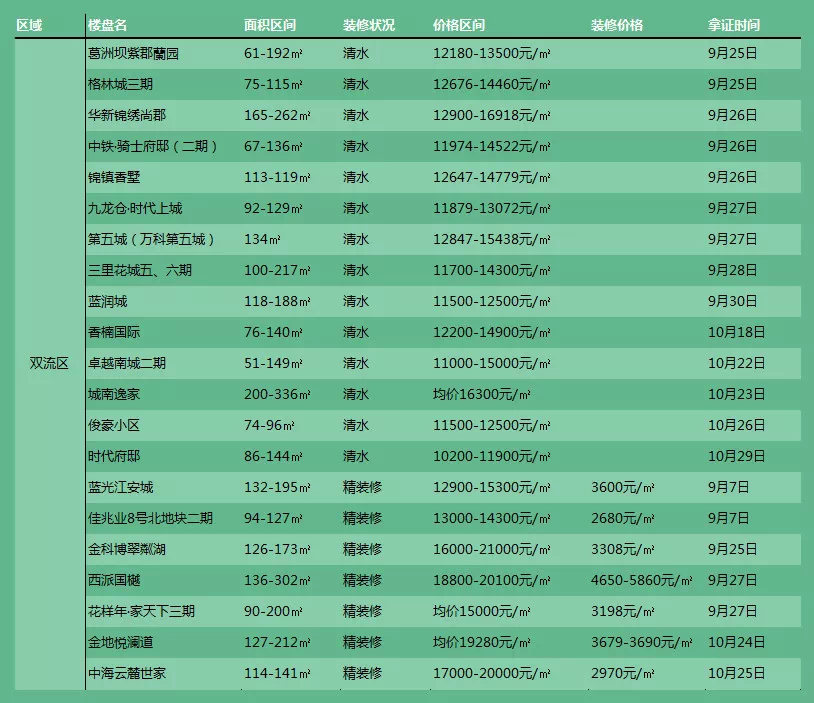 房价较大的赢家还是双流区,清水房都几乎找不到12000元/㎡以下的楼盘,精装房多数价格在15000元/㎡水准,最洋气的还是“双流四小龙”,已经开出的3个楼盘价格均在20000元/㎡左右。