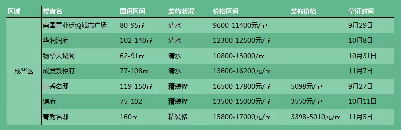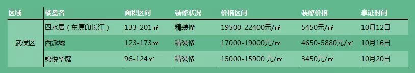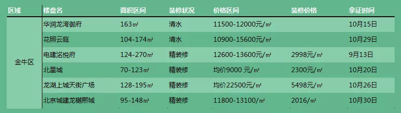 成华区房价基本还在15000元/㎡以下;青羊区开出了11000元/㎡的低价;金牛区房价回到了12000-13000元/㎡,但一环房价也突破2万了;武侯区、锦江区房价20000元/㎡上下。