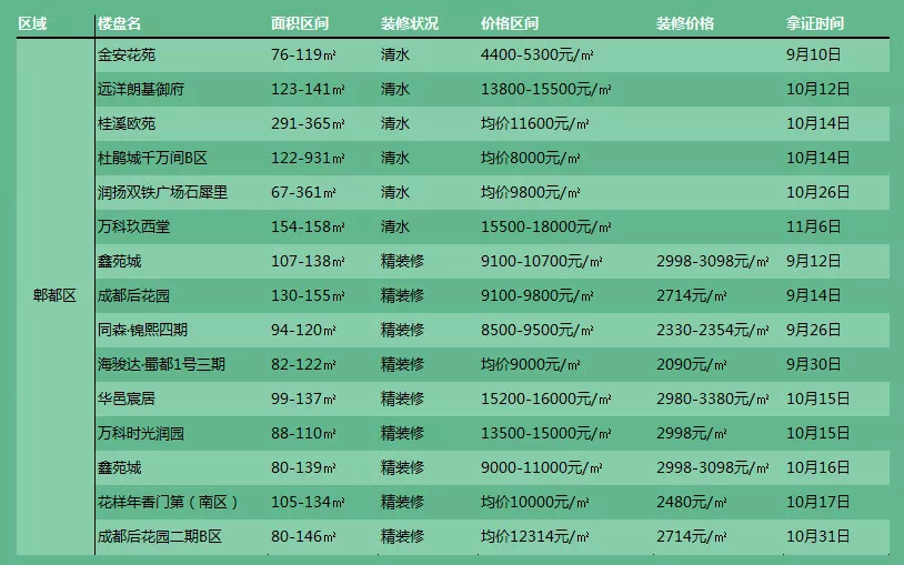 新都、温江品牌楼盘均价10000元/㎡左右,郫都区的房价已经稳稳扎在万元的边沿上了,还有一部分楼盘价格12000元/㎡往上走。