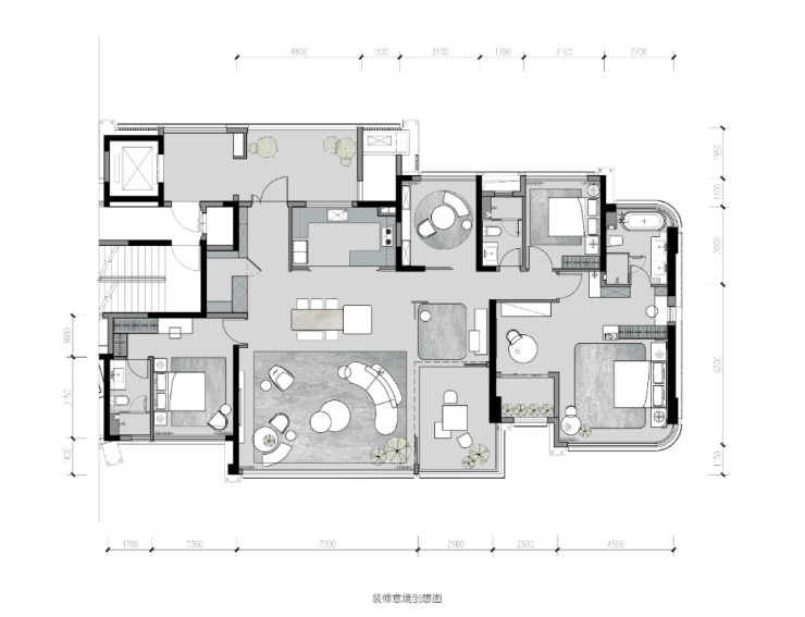 该户型定位家庭社交中心,通过全景空间与双套房设计强化公共区域功能。