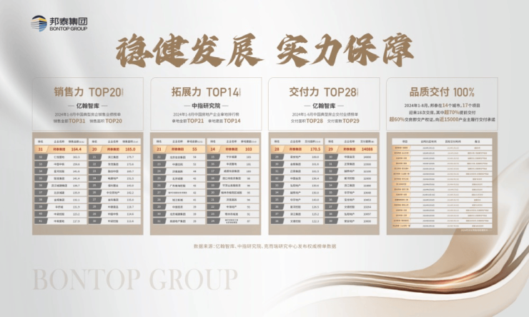 品牌有实力房企稳健经营TOP10,信得过的实力开发商。邦泰集团历经17年稳健发展,进驻全国34座城市,累计开发超130个精品项目,超2500万方开发面积。