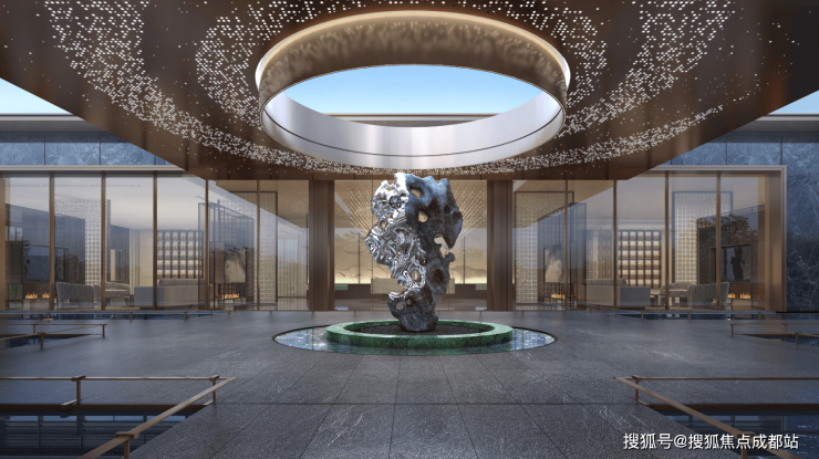 2.入户大堂深灰色铝板搭配灰色石材,锦上系高端定制选材,归家每一步尽显尊崇