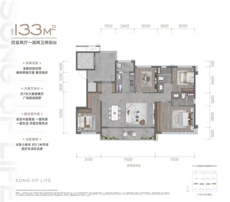 双套房设计,独立家政间,LDK一体化餐客厅,约7.2米景观阳台,尽享舒适人居。