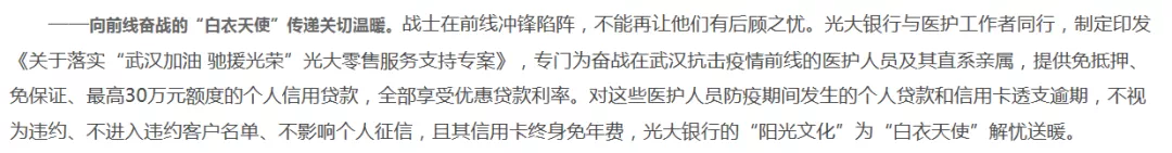 对奋战在武汉抗击疫情前线的医护人员及其直系亲属,较高30万元额度的个人信用贷款,全部享受优惠贷款利率。对这些医护人员防疫期间发生的个人贷款和信用卡透支逾期,不视为违约、不进入违约客户名单、不影响个人征信,且其信用卡终身免年费。