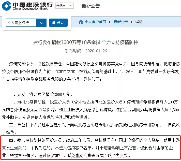 参加疫情防控的医护人员、政府工作人员,疫情期间在建行的个人贷款、信用卡透支发生逾期的,不视为违约,不进入违约客户名单。