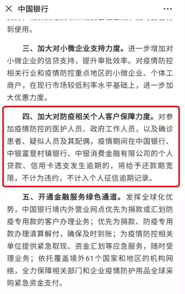 对于因疫情原因导致短期失去收入来源的个人贷款客户给予一定还款宽限,对于参与疫情防控的医护人员、因病隔离的人员的逾期贷款,不计入逾期征信,不收取逾期罚息。