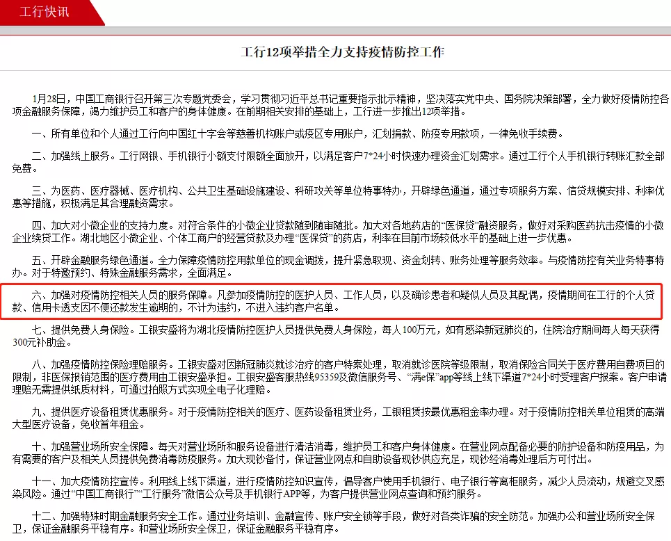 凡参加疫情防控的医护人员、工作人员,以及确诊患者和疑似人员及其配偶,疫情期间在工行的个人贷款、信用卡透支因不便还款发生逾期的,不计为违约,不进入违约客户名单。