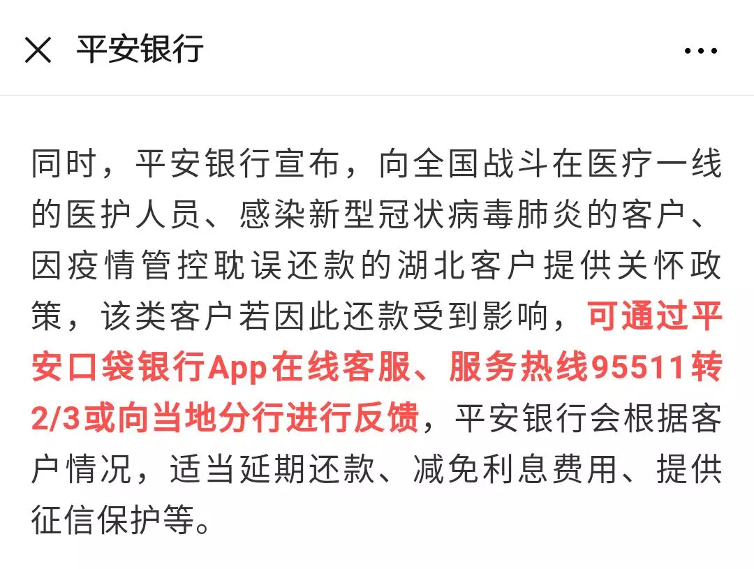 向全国战斗在医疗一线的医护人员、感染新型冠状病毒肺炎的客户、因疫情管控耽误还款的湖北客户提供关怀政策,该类客户若因此还款受到影响,可通过平安口袋银行App在线客服、服务热线95511转2/3或向当地分行进行反馈,给予适当延期还款、减免利息费用、提供征信保护等。