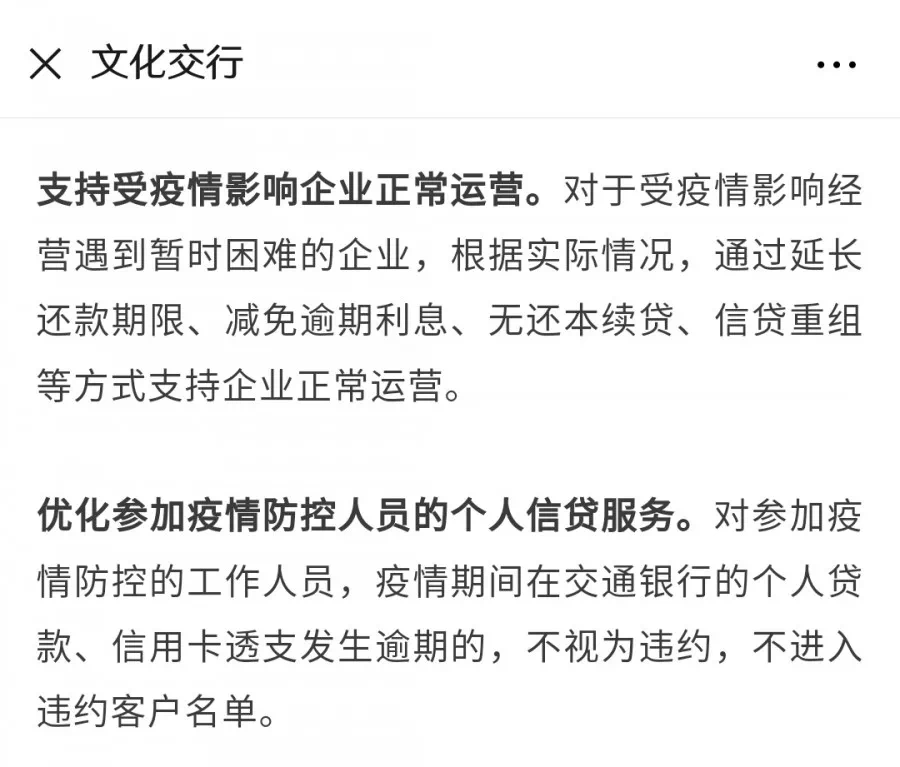 对参加疫情防控的工作人员,疫情期间在交通银行的个人贷款、信用卡透支产生逾期的,不视为违约,不进入违约客户名单。