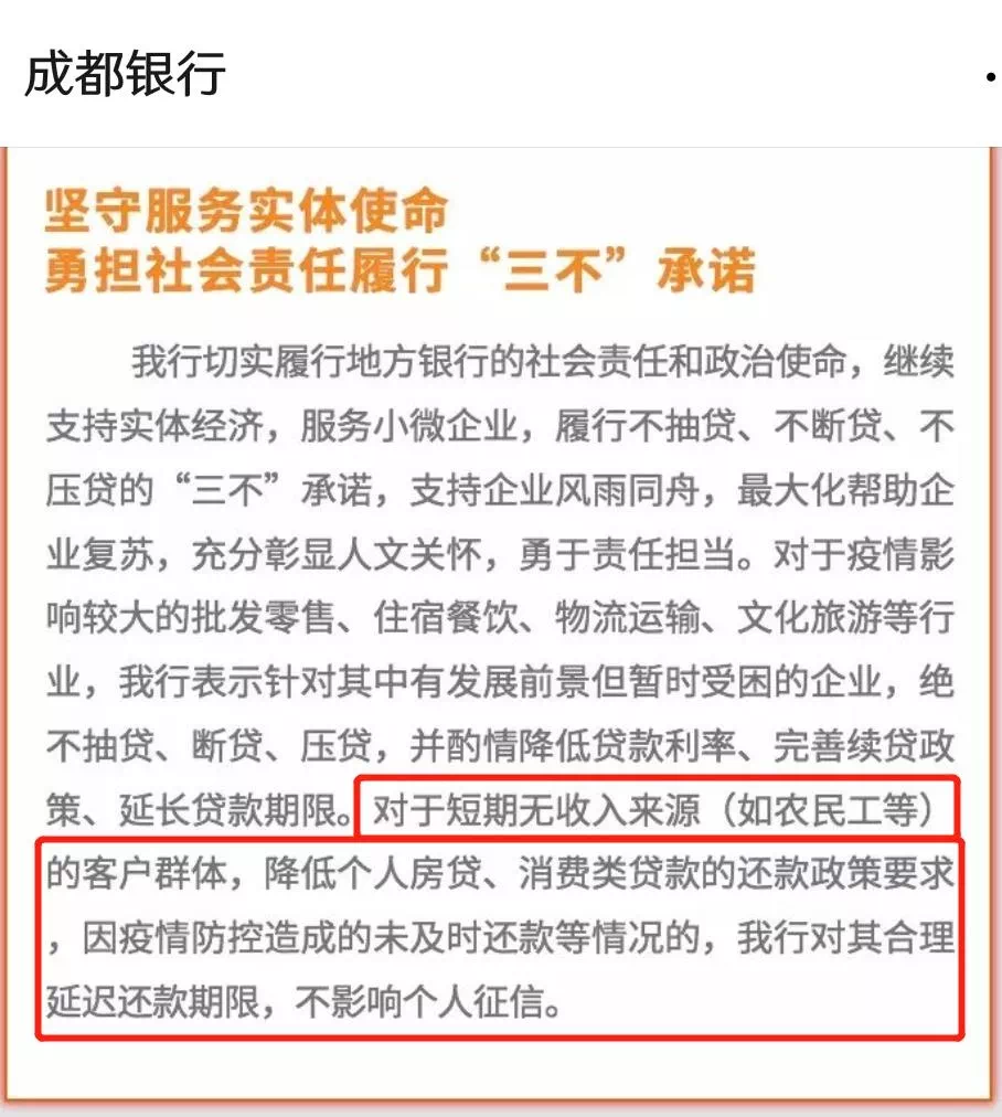 成都银行对短期无收入来源的客户群体,降低个人房贷、消费类贷款的还款政策要求,因疫情防控造成的未及时还款等情况的,对其合理延迟还款期限,不影响个人征信。