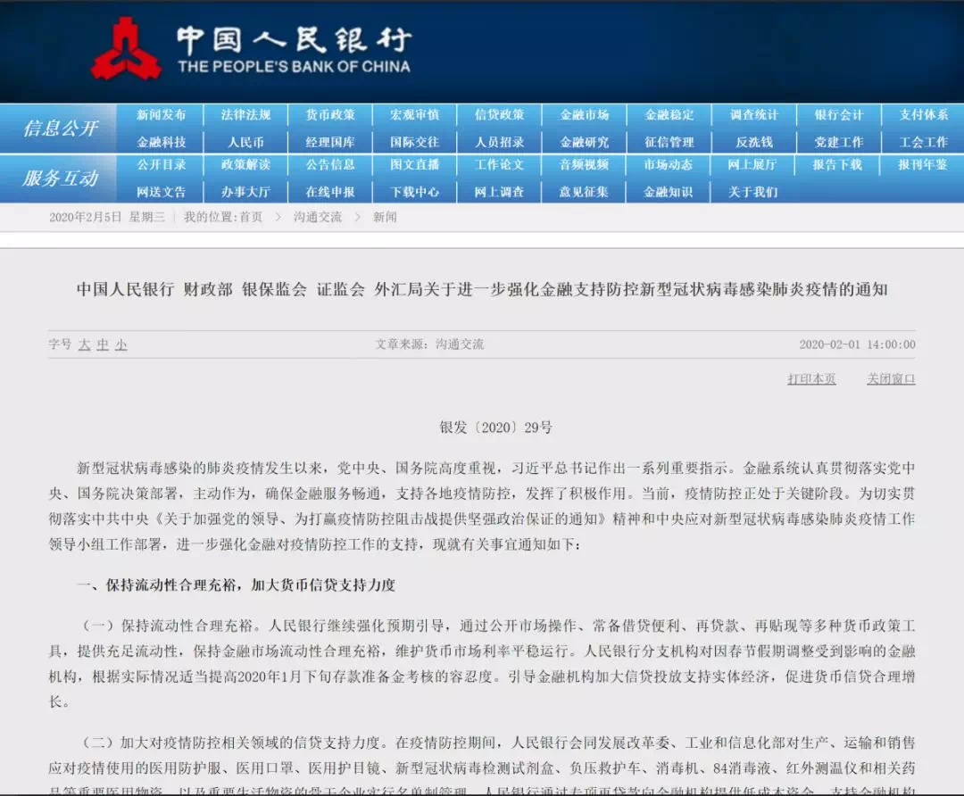 直到近日,央行、财政部、银保监会、证监会、外汇局五部委又联合印发《关于进一步强化金融支持防控新型冠状病毒感染肺炎疫情的通知》,推出30大举措,强化金融对疫情防控的支持。
