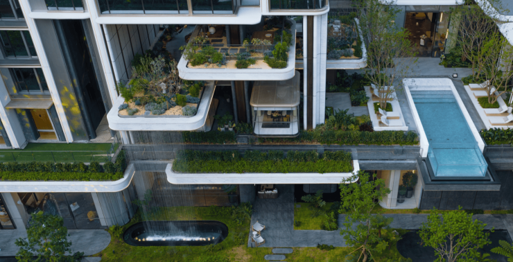 客厅外延的岛式阳台以2.5-3.1米开阔尺度,配合缕空花架与立体绿化系统,实现室内外空间的有机融合。这个兼具功能与美学的过渡地带,既可配置休闲座椅打造户外会客厅,也能作为家庭园艺空间,让自然元素渗透日常生活的每个角落。