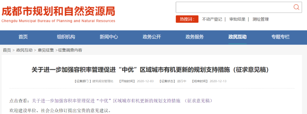 12月3日,成都市规划和自然资源局发布了一则《关于进一步加强容积率管理促进“中优”区域城市有机更新的规定支持措施》,正式面向全社会征求意见。