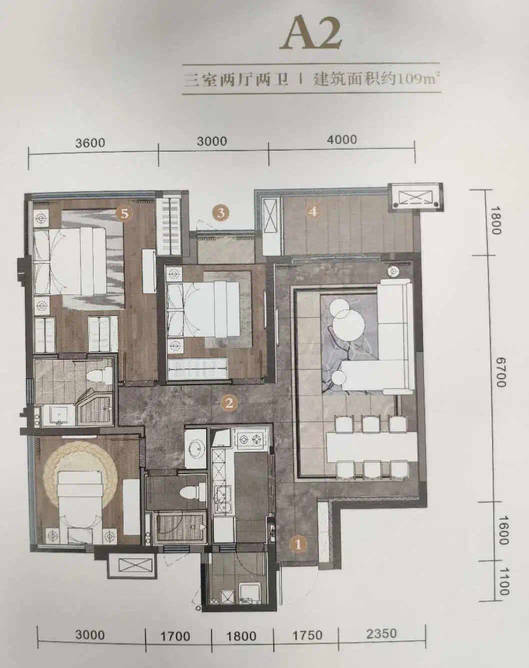 例如,A1户型就赠送有两个次卧飘窗面积,以及客厅阳台、主卧阳台、近半书房、主卫生间部分面积也实现了半赠送。