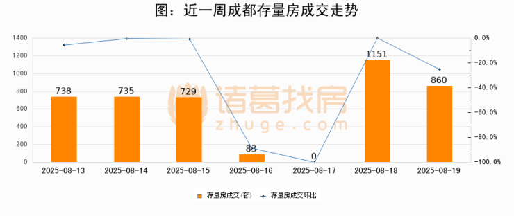 从存量房来看,2025年08月19日成都存量房单日成交860套,比昨日减少291套,环比下降25.3%。从近一周存量房成交来看,成都存量房日均成交套数为613套,08月19日单日成交860套,高于近一周平均水平40.3%。