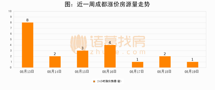 根据诸葛找房数据显示,成都24小时涨价房源量为1套,较08月18日减少1套,环比下降50%。与此同时,涨价房源占比小幅回落,对于购房者来说是一个入市窗口期,购房者可抓住时机入市。