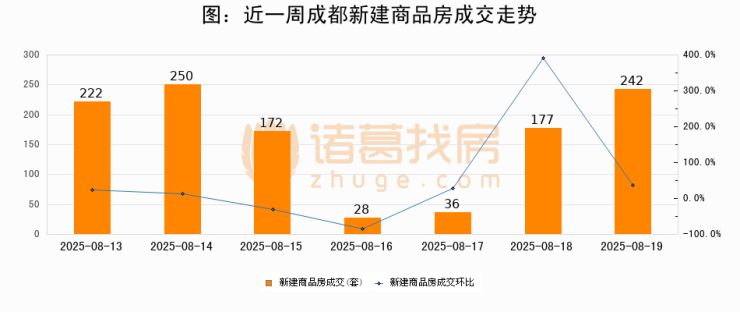 根据成都市住房和城乡建设局数据显示,2025年08月19日成都新建商品房成交242套,较昨日增加65套,环比上涨36.7%。近一周成都新建商品房日均成交161套。08月19日单日成交242套,高于近一周平均水平50.3%。