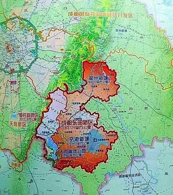 新区规划面积729平方公里,包括简阳市所辖的13个镇,实际上就是以前的天府空港新城(高新东区)+简州新城+天府奥体公园。