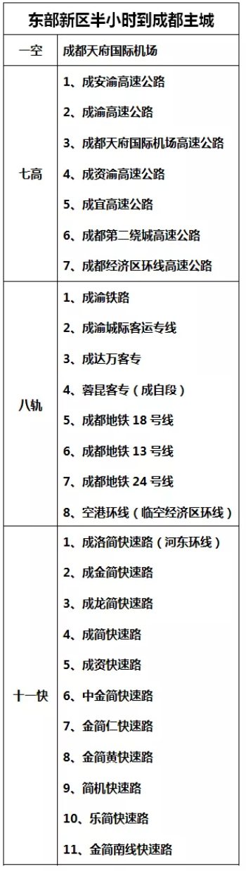 大城市经常都会有“大城市病”,但东部新区直接跳出去建新城,构建一个新组团。未来东部新区是要形成到成都主城区半小时通勤网络的:“1空7高8轨11快”,涵盖高铁、城轨、地铁、快速路。