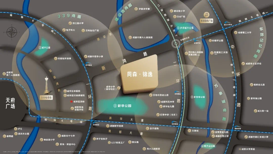 项目与锦江宾馆、岷山饭店就隔了一座锦江桥,到天府广场仅需2站地铁;教育资源的配置可称优质,1公里范围内五朵金花就占了两朵。