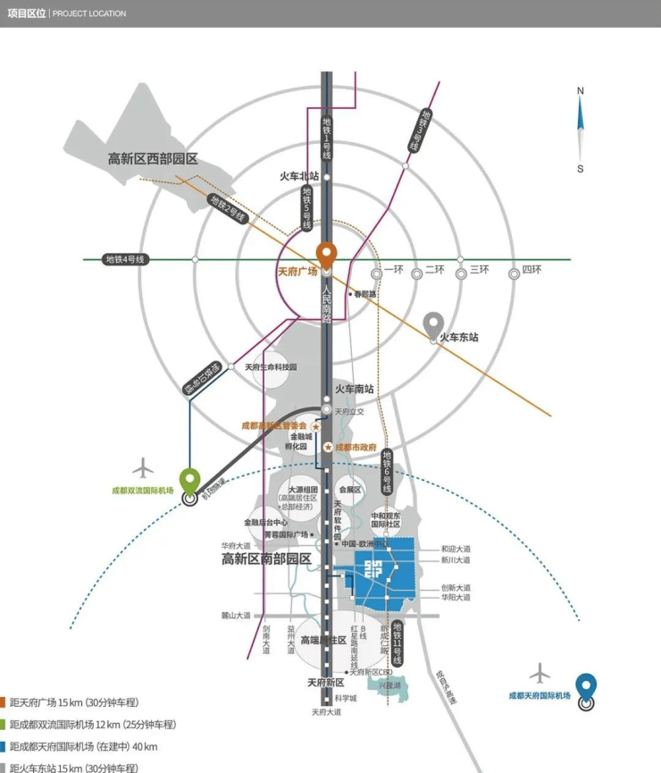 地铁:6号线新通大道站(约200m)、规划20号线和22号线(五期)主要道路:绕城(四环)、麓山大道(五环)、天府大道、梓州大道、蓉遵高速