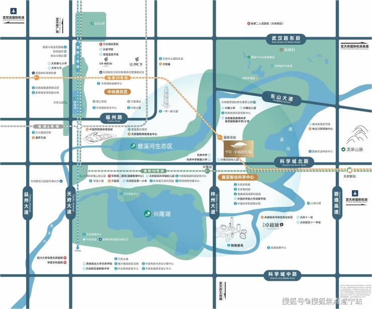 3800亩鹿溪河生态带:一街之隔即可漫步湿地生态走廊,体验公园城市特色的海绵式水文景观。5100亩兴隆湖群:约5公里即是公园城市坐标——兴隆湖湿地公园,被誉为天府新区的"生态之肾"。