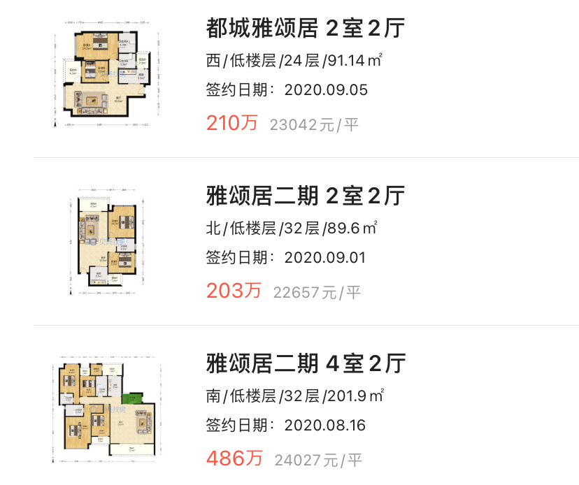 而从成交数据上看,雅颂居成交房源价格在2.2-2.4万/㎡之间,总价多在200万左右。