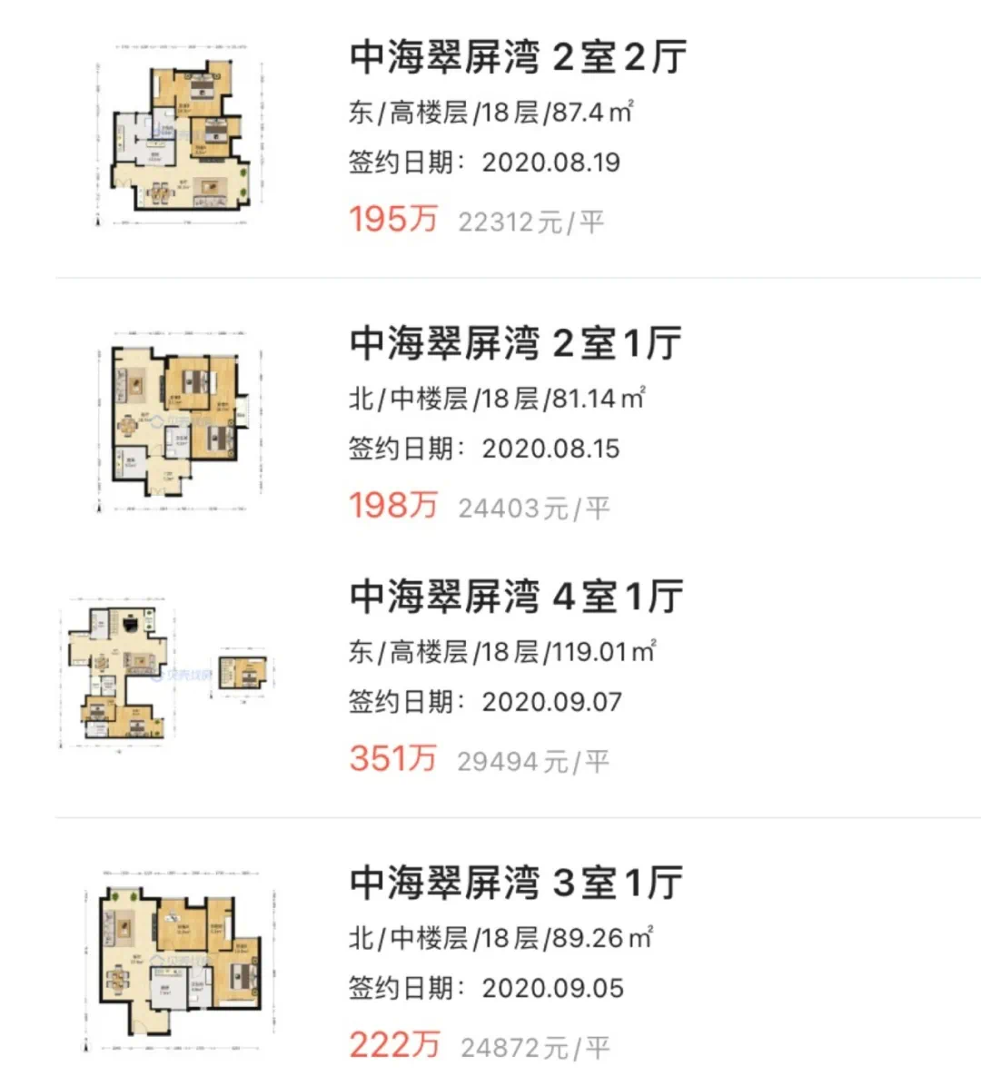 根据贝壳找房数据显示,中海翠屏湾房屋状况稍好的带装修房源,挂牌价多在2.3-2.5万/㎡之间。但是由于有小户型房源,总价还算可控。