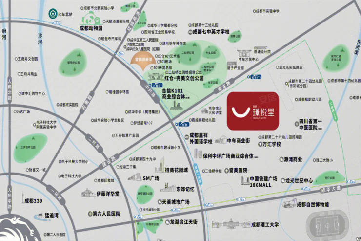教育资源:项目旁有成都七中英才学校、万汇学校成都嘉祥外国语学校、二仙桥学校、成华中学、成华小学、理工大学附属小学、成都第十三幼儿园、成都第二十八幼儿园润翔园、成都第二十四幼儿园、成都第二十四幼儿园(乐彩城分园)等。成华区的教育资源一直都是其短板,目前二八板块强势引入各类教育集团,也是希望尽可能的迎头追赶。