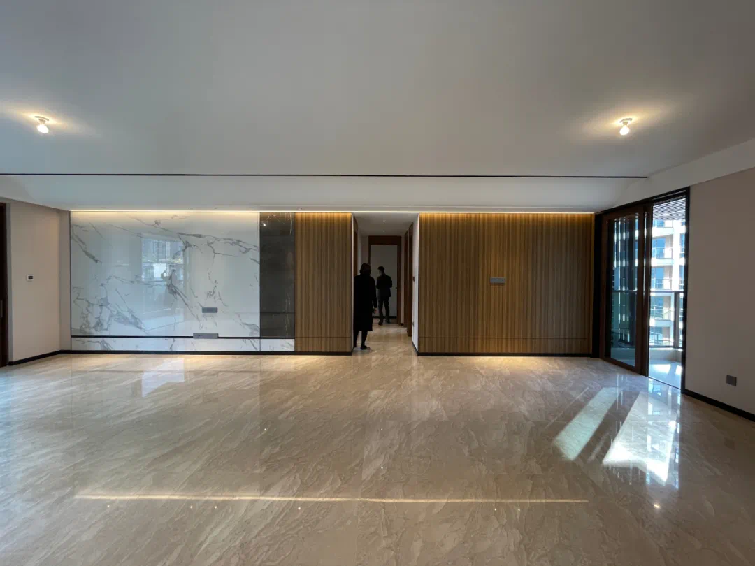此外就是楼栋公区部分,墙面全铺贴,地面也有简单的造型,再搭配与室内色调统一的双开入户大门,整体质感还是不错的。