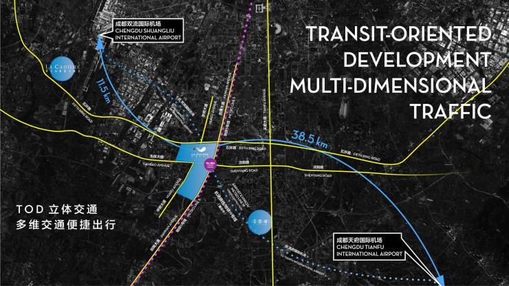 从这里乘坐 19 号线 10 分钟抵达双流国际机场,30 分钟抵达天府国际机场。众所周知,成都和北京是全国仅有的两座双 4F 机场的城市。 5 号线已经开通,从这里乘坐地铁仅 6 站可以抵达高新区锦城湖。