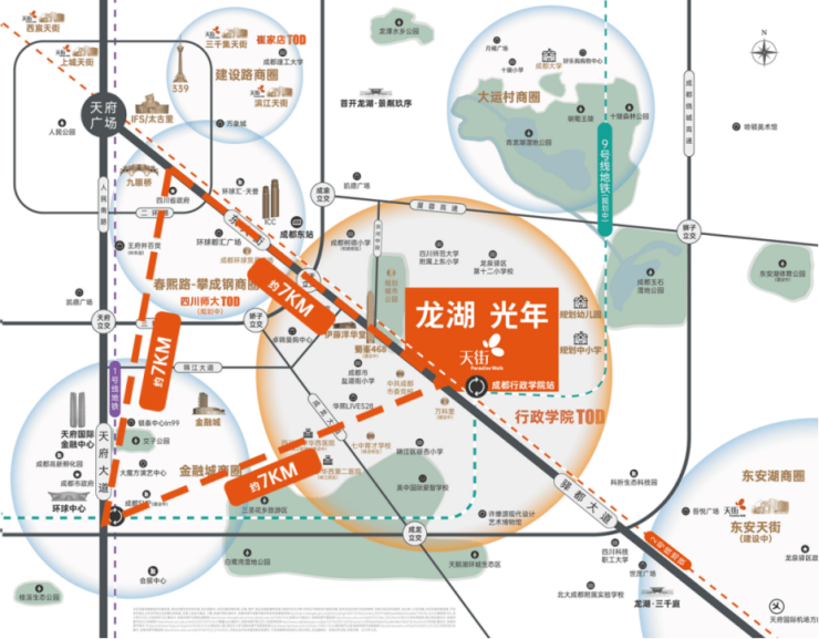 交通:项目与地铁2号线、9号线(规划)双轨换乘,通过TOD的有效串联和转化,5站可达金融城,6站到达攀成钢,10站可达春熙路。