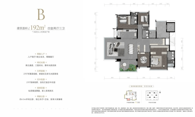 南向面宽达16.6米,7米横厅设计,三卧朝南。端户主卧270°采光,配备双台盆卫生间及超大采光衣帽间。