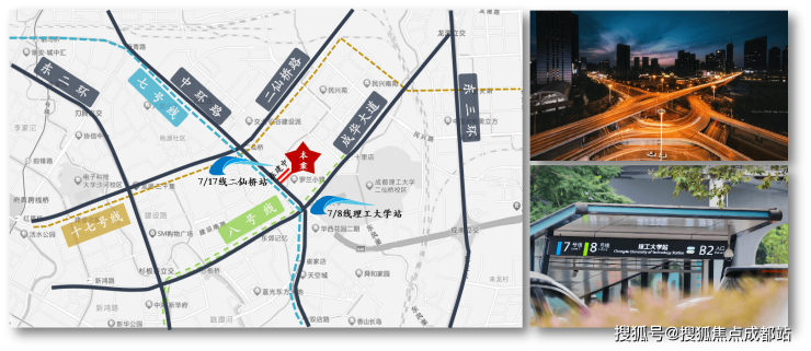 500M范围内,7/8号线交汇(理工大学站)7/17号线待建交汇(二仙桥站);三横三纵干道交通,六条主干道接驳全城。轨道/干道交通多重选择纵横全城