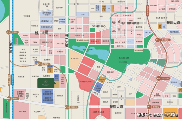 天府软件园与新川板块的核心交汇处,高新南“承上启下”的核心板块;以AI创新中心为核心的产业区,以银都紫藤中学为核心的新川首熟住区,以及新川之心为代表的湖区所组成的“产业+住区+湖区”中心地段,形成高新南“黄金三角芯”,新川核心地段的最后一块拼图。