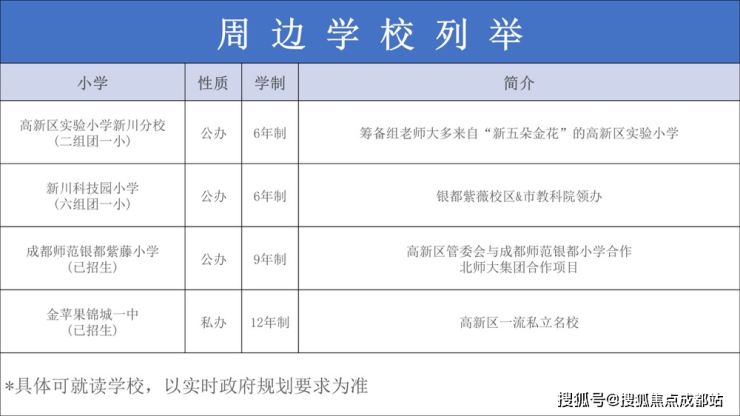 成都师范银都紫藤小学(南北校区),高新区实验小学新川分校(成都新五朵金花之一),新川科技园小学(成都市教科院和银都紫藤联合打造),四川省教科院附属中学等