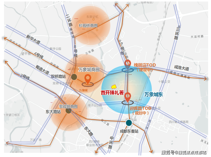 东二环战略地位:作为主城发展起源地与高端居住聚集地,东二环已形成媲美金融城的潮流文化中心。项目占据万象城东侧,毗邻攀成钢、杉板桥板块,构成“黄金三角”高端居住区。