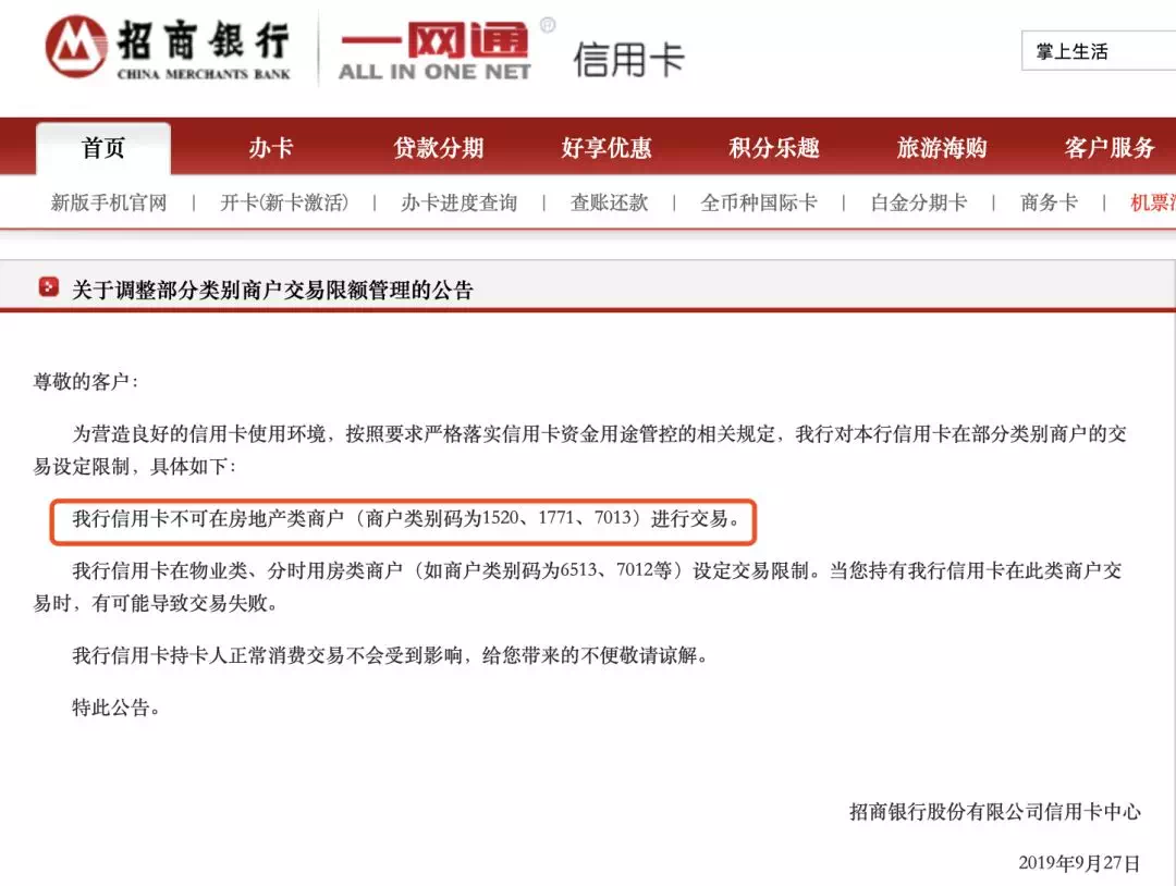 以招行为例,9月27日,招行信用卡中心发布公告称,该行信用卡不可在3类房地产类商户(商户类别码为1520、1771、7013)进行交易;在物业类、分时用房类商户(如商户类别码为6513、7012等)设定交易限制。当客户持有该行信用卡在这些商户交易时,有可能导致交易失败。