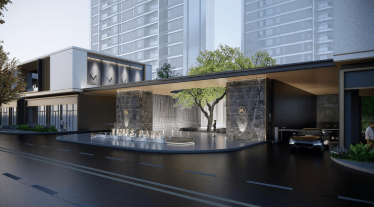 主入口采用门庭与景观一体化设计。超30米阔尺仪门与约5.6米挑高,采用深灰石材墙面与铝板顶饰,彰显尊崇气质;