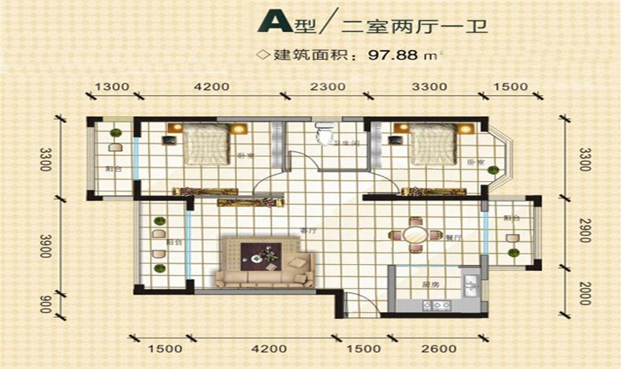 2室2厅1卫-A户型 两室两厅一卫 97.88㎡