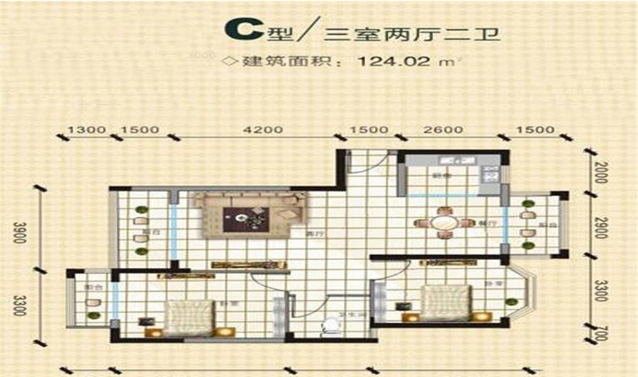 3室2厅2卫-C户型 三室两厅两卫 124.02㎡